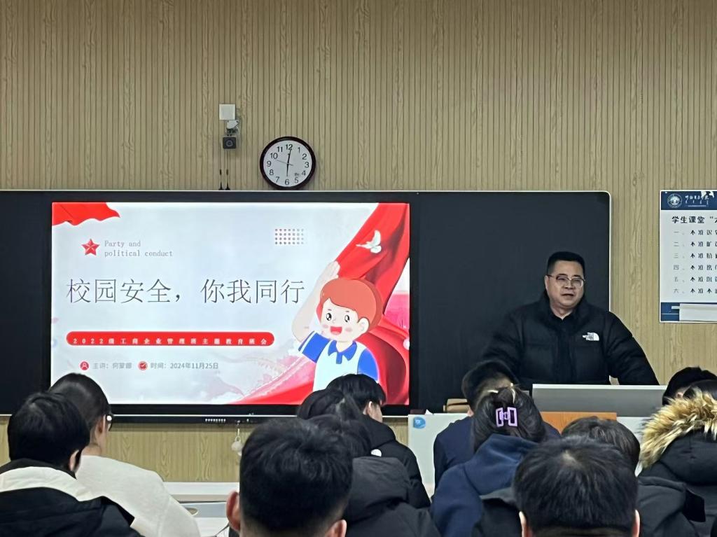 为深入贯彻公司领导干部联系员工班级制度,持续加强领导干部与员工的常态化交流,帮助员工解决实际问题,有效形成“三全育人”浓厚氛围,11月25日,利来w66校园安全管理处处长王利国到利来国际2022级工商企业管理班开展联系班级工作,参加“校园安全,你我同行”主题班会。
