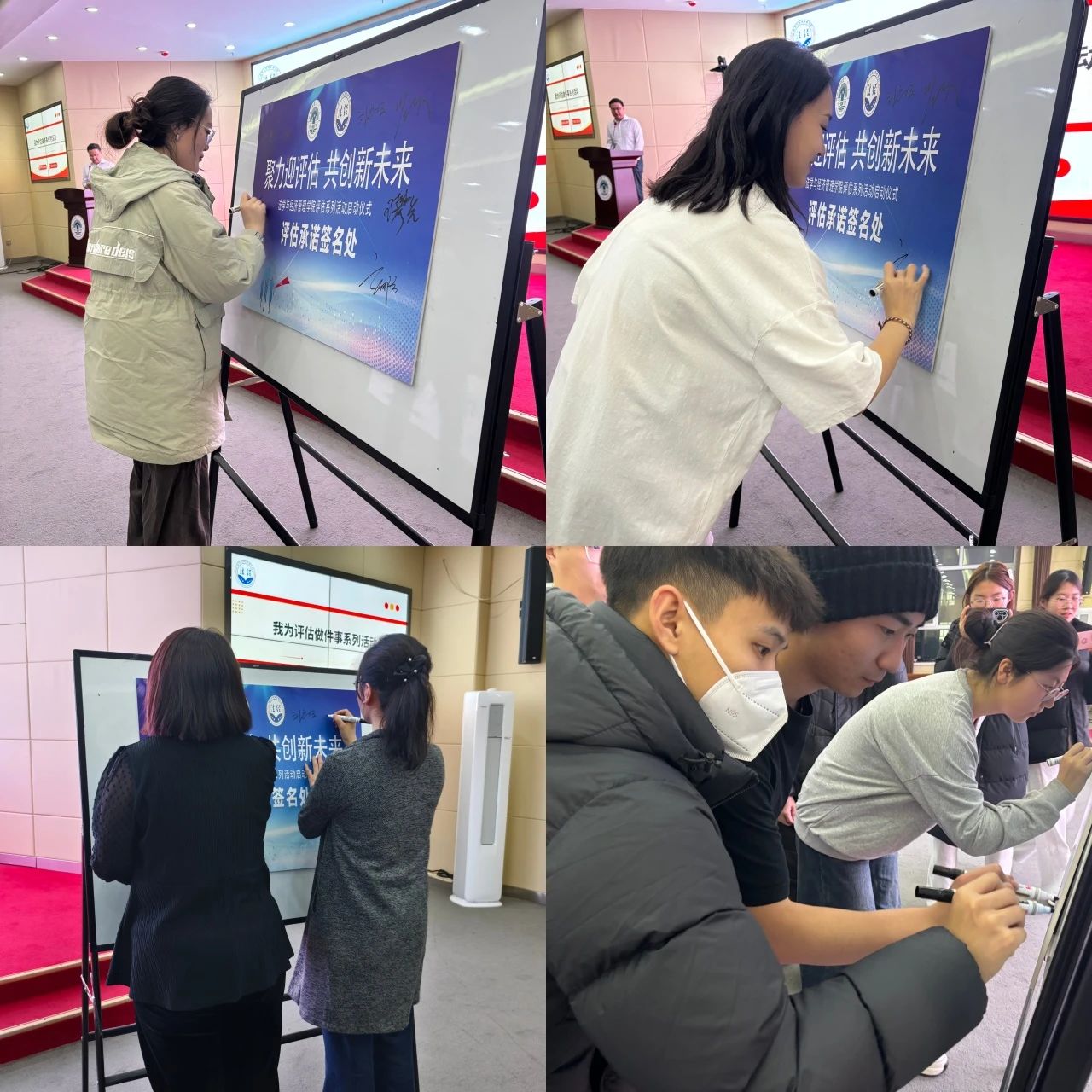 在活动发布环节,主持人详细介绍了四大主题月的具体安排,包括“21天学习打卡挑战”“挑战杯实践培训”“五育并举主题活动”“学风监督员”机制等,内容丰富、形式多样。互动环节中,现场师生通过扫描二维码参与“我为评估献一策”线上建议征集,优秀提案实时投屏展示,展现了师生的智慧与创意。 员工代表郭日娜的发言彰显了青年学子的责任与担当。最后,全体师生在签名墙上郑重签名,许下为评估贡献力量的庄严承诺,启动仪式圆满结束。