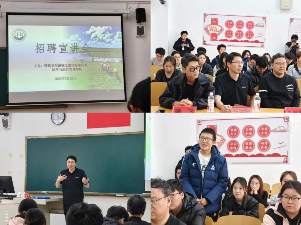 为进一步拓宽毕业生就业渠道,搭建校企合作平台,3月26日下午,利来国际与呼伦贝尔游牧之旅国际旅行社有限公司在崇文楼A座413联合举办专场招聘宣讲会。呼伦贝尔游牧之旅国际旅行社有限公司副总经理王三军、直播团队负责人滕飞,团学办主任王旭轩、辅导员高郁方及各年级员工代表参加本次活动。