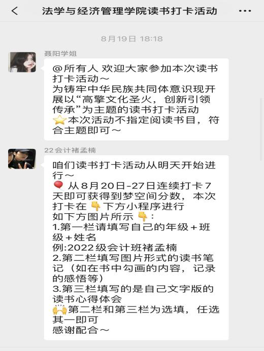 读书谓已多,抚事知不足。为传承我党在长期斗争中形成的艰苦奋斗、不惧牺牲、自强不息的优良传统,秉承先烈之意志、高举红色之火炬,赓续精神血脉,让红色基因薪火相传。2023年8月19日至8月27日,利来国际团总支组织了以“高擎文化圣火,创新引领传承”为主题的读书打卡活动,利来国际部分同学参加。